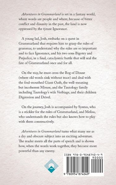 Adventures in Grammarland is set in a fantasy world, where words are people and where, because of bitter conflict and disunity in the past, the land is now oppressed by the tyrant Ignorance. A young lad, Josh, embarks on a quest in Grammarland that requires him to grasp the rules of grammar, to understand why the rules are so important and to face Ignorance, and his two sons Bigotry and Prejudice, in a final, cataclysmic battle that will seal the fate of Grammarland once and for all. On the way, he must cross the Bog of Disuse (where old words sink without trace) and deal with the foul-mouthed Giant Oath, the well-meaning but incoherent Misuse, and the Tautology family including Tautology's wife Verbiage, and their children Digression and Drivel. On the journey, Josh is accompanied by Syntax, who is a stickler for the rules of Grammarland, and Melisa, who understands the rules but also knows how to play with them constructively. Adventures in Grammarland turns what many see as a dry and obscure subject into an exciting adventure. The reader meets all the parts of speech and is shown how, when the words work together, they become more powerful than any enemy. This is a book for anyone, from the age of 9 to 90, who enjoys an exciting story, especially if they have an interest in language.