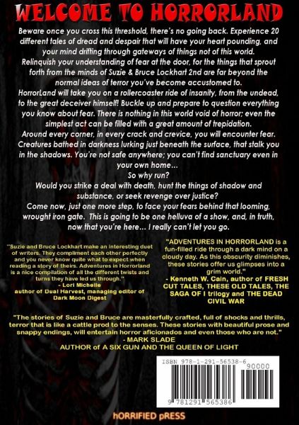 Beware once you cross this threshold, there's no going back. Experience 20 different tales of dread and despair that will have your heart pounding, and your mind drifting through gateways of things not of this world. Relinquish your understanding of fear at the door, for the things that sprout forth from the minds of Suzie & Bruce Lockhart 2nd are far beyond the normal ideas of terror you've become accustomed to. HorrorLand will take you on a rollercoaster ride of insanity, from the undead, to the great deceiver himself! Around every corner, in every crack and crevice, you will encounter terror. You can't find sanctuary even in your own home... So why run? Would you strike a deal with death, hunt the things of shadow and substance, or seek revenge over justice? Come now, just one more step, to face your fears behind that looming, wrought iron gate. This is going to be one helluva of a show, and, in truth, now that you're here... I really can't let you go.