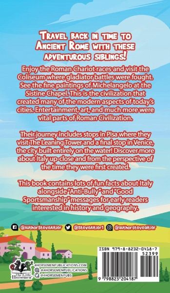 Travel back in time to Ancient Rome with these adventurous siblings! Enjoy the Roman Chariot races and visit the Coliseum where gladiator battles were fought. See the fine paintings of Michelangelo at the Sistine Chapel. This is the civilization that created many of the modern aspects of today's cities. Entertainment, art, and much more were vital parts of Roman Civilization. Their journey includes stops in Pisa where they visit The Leaning Tower and a final stop in Venice, the city built entirely on the water! Discover more about Italy up-close and from the perspective of the time they were first created. This book contains lots of fun facts about Italy alongside "Anti-Bully" and "Good Sportsmanship" messages for early readers interested in history and geography.