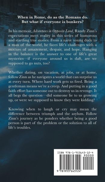 When in Rome, do as the Romans do. But what if everyone is bonkers? In his memoir, Adventures in Opposite Land, Randy Zinn's expectations meet reality in this series of humorous and startling true stories. From a naïve young dude to a man of the world, he faces life's challenges with a mixture of amazement, despair, and hope. Hanging in the balance is the answer to one of life's great mysteries-if everyone around us is daft, are we supposed to go nuts, too? Whether dating, on vacation, at jobs, or at home, follow Zinn as he navigates a world that can surprise us at every turn. Where hard work gets us fired. Being a gentleman means we're a creep. And putting in a good faith effort has someone out to destroy us in revenge. It all begs the question-did someone lie to us growing up, or were we supposed to know they were kidding? Knowing when to laugh or cry may mean the difference between triumph and the asylum. Follow Zinn's journey as he ponders whether being a good person is part of the problem or the solution to all of life's troubles.