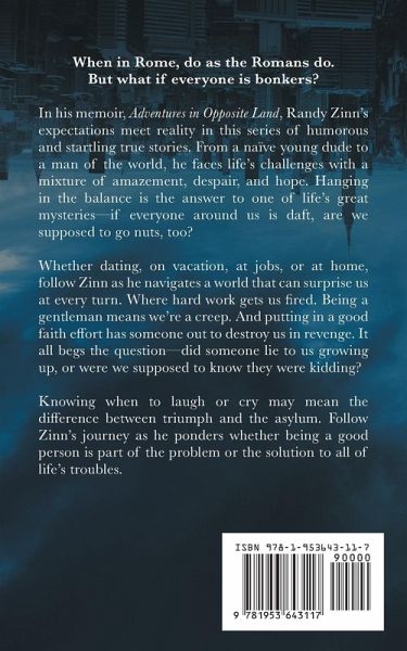 When in Rome, do as the Romans do. But what if everyone is bonkers? In his memoir, Adventures in Opposite Land, Randy Zinn's expectations meet reality in this series of humorous and startling true stories. From a naïve young dude to a man of the world, he faces life's challenges with a mixture of amazement, despair, and hope. Hanging in the balance is the answer to one of life's great mysteries-if everyone around us is daft, are we supposed to go nuts, too? Whether dating, on vacation, at jobs, or at home, follow Zinn as he navigates a world that can surprise us at every turn. Where hard work gets us fired. Being a gentleman means we're a creep. And putting in a good faith effort has someone out to destroy us in revenge. It all begs the question-did someone lie to us growing up, or were we supposed to know they were kidding? Knowing when to laugh or cry may mean the difference between triumph and the asylum. Follow Zinn's journey as he ponders whether being a good person is part of the problem or the solution to all of life's troubles.