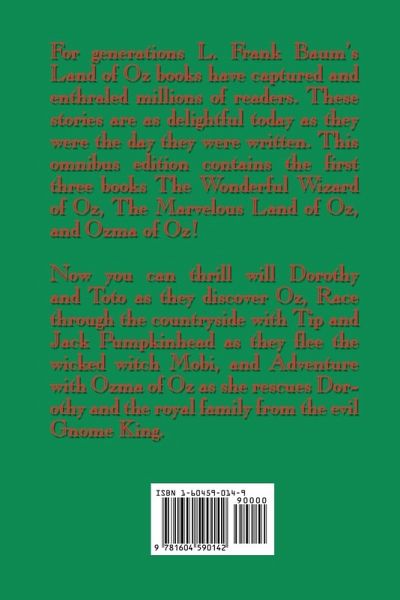 For generations L. Frank Baum's Land of Oz books have captured and enthralled millions of readers. These stories are as delightful today as they were the day they were written. This omnibus edition contains the first three books The Wonderful Wizard of Oz, The Marvelous Land of Oz, and Ozma of Oz! Now you can thrill will Dorothy and Toto as they discover Oz, Race through the countryside with Tip and Jack Pumpkinhead as they flee the wicked witch Mobi, and Adventure with Ozma of Oz as she rescues Dorothy and the royal family from the evil Gnome King.