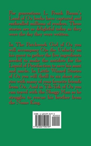 For generations L. Frank Baum's Land of Oz books have captured and enthralled millions of readers. These stories are as delightful today as they were the day they were written. In The Patchwork Girl of Oz you will accompany Ojo the Unlucky on his quest to gather the five ingredients needed to make the antidote for the Liquid of Petrifaction to save his aunt and uncle. In Little Wizard Stories of Oz you will thrill to six short stories with many of your favorite friends from Oz. And in Tik-Tok of Oz you can travel with the Shaggy Man as he struggles to rescue his brother from the Nome King.
