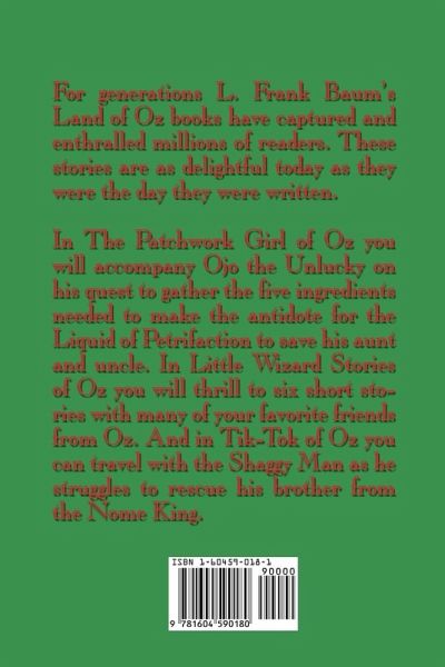 For generations L. Frank Baum's Land of Oz books have captured and enthralled millions of readers. These stories are as delightful today as they were the day they were written. In The Patchwork Girl of Oz you will accompany Ojo the Unlucky on his quest to gather the five ingredients needed to make the antidote for the Liquid of Petrifaction to save his aunt and uncle. In Little Wizard Stories of Oz you will thrill to six short stories with many of your favorite friends from Oz. And in Tik-Tok of Oz you can travel with the Shaggy Man as he struggles to rescue his brother from the Nome King.