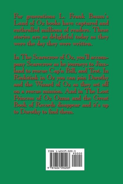 For generations L. Frank Baum's Land of Oz books have captured and enthralled millions of readers. These stories are as delightful today as they were the day they were written. In The Scarecrow of Oz, you'll accompany Scarecrow as he journeys to Jinxland to rescue Cap'n Bill, and Trot. In Rinkitink in Oz you can join Dorothy and the Wizard of Oz as they set off on a rescue mission. And in The Lost Princess of Oz Ozma and the Great Book of Records disappear and it's up tp Dorothy to find them.