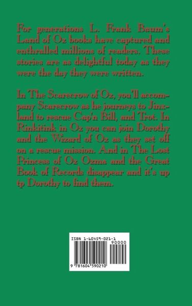 For generations L. Frank Baum's Land of Oz books have captured and enthralled millions of readers. These stories are as delightful today as they were the day they were written. In The Scarecrow of Oz, you'll accompany Scarecrow as he journeys to Jinxland to rescue Cap'n Bill, and Trot. In Rinkitink in Oz you can join Dorothy and the Wizard of Oz as they set off on a rescue mission. And in The Lost Princess of Oz Ozma and the Great Book of Records disappear and it's up tp Dorothy to find them.