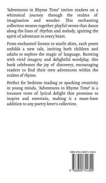 "Adventures in Rhyme Time" invites readers on a whimsical journey through the realms of imagination and wonder. This enchanting collection weaves together playful verses that dance along the lines of rhythm and melody, igniting the spirit of adventure in every heart. From enchanted forests to starlit skies, each poem unfolds a new tale, inviting both children and adults to explore the magic of language. Bursting with vivid imagery and delightful wordplay, this book celebrates the joy of discovery, encouraging readers to find their own adventures within the realms of rhyme. Perfect for bedtime reading or sparking creativity in young minds, "Adventures in Rhyme Time" is a treasure trove of lyrical delight that promises to inspire and entertain, making it a must-have addition to any poetry lover's collection.