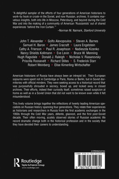 American historians of Russia have always been an intrepid lot. Their research trips were spent not in Cambridge or Paris, Rome or Berlin, but in Soviet dormitories with official monitors. They were seeking access to a historical record that was purposefully shrouded in secrecy, boxed up and locked away in closed archives. Their efforts, indeed their curiosity itself, sometimes raised suspicion at home as well as in a Soviet Union that did not want to be known even while it felt misunderstood. This lively volume brings together the reflections of twenty leading specialists on Russian history representing four generations. They relate their experiences as historians and researchers in Russia from the first academic exchanges in the 1950s through the Cold War years, detente, glasnost, and the first post-Soviet decade. Their often moving, acutely observed stories of Russian academic life record dramatic change both in the historical profession and in the society that they have devoted their careers to understanding.