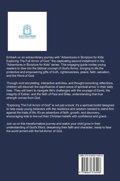 Step into the vibrant world of spiritual armor with "Adventures in Scripture for Kids: Exploring The Full Armor of God," the second book in the enriching "Adventures in Scripture for Kids" series. This captivating guide is your child's companion on a thrilling journey to understand and embody the strength and protection offered through God's Armor. Drawing inspiration from Ephesians 6:10-18, this book brings to life the significance of truth, righteousness, peace, faith, salvation, and God's Word, transforming these biblical concepts into a relatable and immersive experience for young believers. With each chapter, "Exploring The Full Armor of God" looks at the need for and practical application of wearing spiritual armor in daily life. Through well known stories, reflective discussions, and hands-on activities, children will learn to navigate life's challenges with courage, integrity, and a steadfast faith in God. This book illuminates the path to spiritual resilience, teaching kids how to stand firm against the trials and temptations they face, armed with the power of God's Word and His unyielding love. As young readers journey through this book, they'll encounter biblical heroes who exemplified God's Armor in action, from David's unwavering faith that brought down a giant to Esther's righteous bravery that saved her people. These stories are not just tales from the past but are mirrors reflecting the daily battles we face, showcasing the timeless relevance of God's protection in our lives. "Exploring The Full Armor of God" is more than a book; it's an invitation to embark on an adventure of faith, growth, and discovery. It's a call to embrace the fullness of God's protection and to step out into the world with confidence, knowing that we are equipped with the spiritual armor necessary to face any challenge. Join us on this transformative journey as "Exploring The Full Armor of God" guides your child to put on each piece of God's Armor and to live out the victorious Christian life God intends for them. This book is a treasure trove of spiritual wisdom, interactive learning, and godly principles, designed to deepen your child's understanding of the Bible and to cultivate a strong, vibrant faith that influences every aspect of their life. Embark on this exciting adventure today with "Adventures in Scripture for Kids: Exploring The Full Armor of God" and watch your child grow in strength, faith, and character, fully equipped to be the person God has called them to be. Equip your child with more than just stories; give them the armor they need to face the world with confidence and faith. Don't let this journey pass you by. Grab your copy of "Adventures in Scripture for Kids: Exploring The Full Armor of God" today and set sail on an epic adventure of faith, courage, and discovery. Let the pages of this book be the beginning of a lifelong quest for God's truth, armor, and strength.