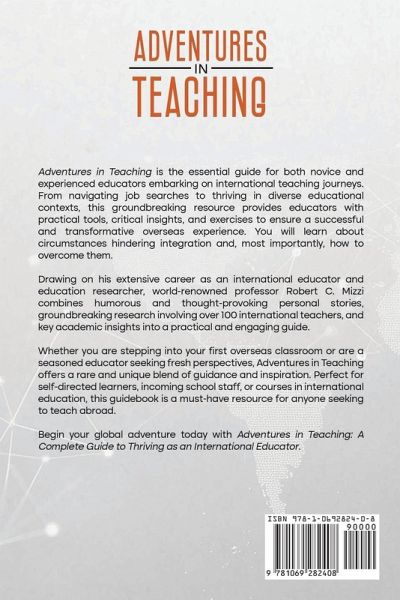 Adventures in Teaching is the essential guide for both novice and experienced educators embarking on international teaching journeys. From navigating job searches to thriving in diverse educational contexts, this groundbreaking resource provides educators with practical tools, critical insights, and exercises to ensure a successful and transformative overseas experience. You will learn about circumstances hindering integration and, most importantly, how to overcome them. Drawing on his extensive career as an international educator and education researcher, world-renown professor Robert C. Mizzi combines humorous and thought-provoking personal stories, groundbreaking research involving over 100 international teachers, and key academic insights into a practical and engaging guide. Whether you are stepping into your first overseas classroom or are a seasoned educator seeking fresh perspectives, Adventures in Teaching offers a rare and unique blend of guidance and inspiration. Perfect for self-directed learners, incoming school staff, or courses in international education, this guidebook is a must-have resource for anyone seeking to teach abroad.