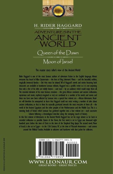 The master story teller's view of the Ancient World Rider Haggard is one of the most famous authors of adventure fiction in the English language. Almost everyone has heard of Allan Quatermain-the hero of King Solomon's Mines-and the beautiful, ruthless, magically immortal Ayesha-She 'who must be obeyed.' All of Haggard's novels and stories featuring both characters are available in handsome Leonaur editions. Haggard was a prolific writer so it is not surprising that only a few of his titles are widely known-and read-by an audience which would enjoy them all. The essential elements of his most famous creations-the great African continent and ancient civilisations, mysterious and exotic, mythical, imagined or real, are combined in a number of his novels and stories and these too have now been collected by Leonaur into a special four volume set-African Adventures. Readers will therefore be unsurprised to learn that Haggard could not resist writing a number of tales about ancient civilisations, or that in these he naturally gravitated towards the most evocative of them all-the world of the Ancient Egyptians and the other peoples of the Mediterranean and the Middle East. This is a stunning body of fiction which Leonaur has gathered together into a four volume set-each successive volume following a chronological time-line along the sweeping march of history. In this first volume of Adventures in the Ancient World, Haggard has set his stage almost as far back in recorded civilisation as possible. Queen of the Dawn, the first novel, is set in Egypt one thousand eight hundred years before the time of Christ in the time of the Shepherd King Apepi. The second novel, Moon of Israel, is also set in Egypt-in the 13th Century BC at the time of Pharaoh Amenmeses-and centres around the Biblical Exodus. Available in softcover and hardcover with dust jacket for collectors.