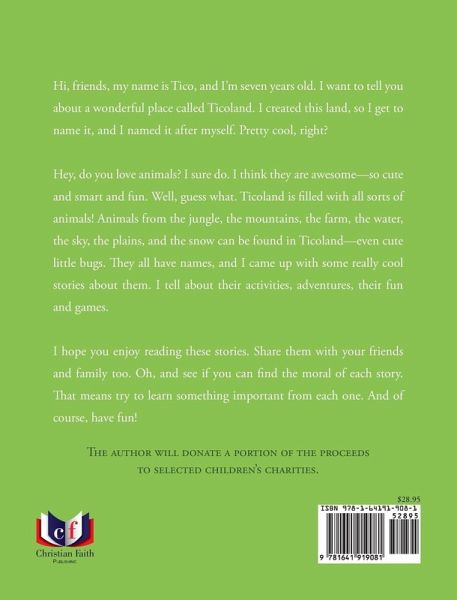 Hi, friends, my name is Tico, and I’m seven years old. I want to tell you about a wonderful place called Ticoland. I created this land, so I get to name it, and I named it after myself. Pretty cool, right? Hey, do you love animals? I sure do. I think they are awesome—so cute and smart and fun. Well, guess what. Ticoland is filled with all sorts of animals! Animals from the jungle, the mountains, the farm, the water, the sky, the plains, and the snow can be found in Ticoland—even cute little bugs. They all have names, and I came up with some really cool stories about them. I tell about their activities, adventures, their fun and games. I hope you enjoy reading these stories. Share them with your friends and family too. Oh, and see if you can find the moral of each story. That means try to learn something important from each one. And of course, have fun!