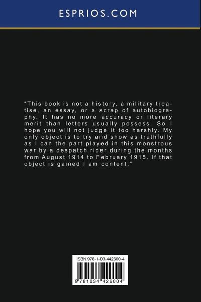 "This book is not a history, a military treatise, an essay, or a scrap of autobiography. It has no more accuracy or literary merit than letters usually possess. So I hope you will not judge it too harshly. My only object is to try and show as truthfully as I can the part played in this monstrous war by a despatch rider during the months from August 1914 to February 1915. If that object is gained I am content."