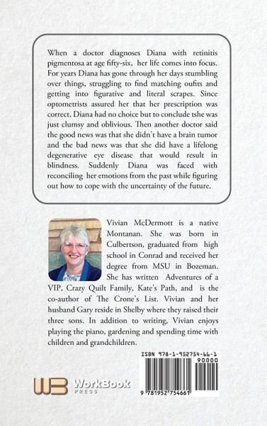 When a doctor diagnoses Diana with retinitis pigmentosa at age fifty-six, her life comes into focus. For years Diana has gone through her days stumbling over things, struggling to find matching oufits and getting into figurative and literal scrapes. Since optometrists assured her that her prescription was correct, Diana had no choice but to conclude tshe was just clumsy and oblivious. Then another doctor said the good news was that she didn't have a brain tumor and the bad news was that she did have a lifelong degenerative eye disease that would result in blindness. Suddenly Diana was faced with reconciling her emotions from the past while figuring out how to cope with the uncertainty of the future.