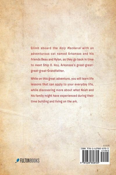 Climb aboard the Holy Mackerel with an adventurous cat named Arkansas and his friends Beau and Rylan as they go back in time to meet Ship O. Hoy, Arkansas's great-great-great-great-grandfather who was on the ark with Noah. While on this great adventure, you will learn life lessons that can apply to your everyday life while discovering more about what Noah and Ship O. Hoy experienced when they built the ark and in the time they spent on the ark during the great flood.