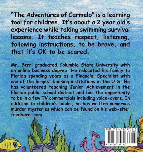 "The Adventures of Carmelo-Swim Survival Lessons" is a learning tool for children. It's about a 2 year old's experience while taking swimming survival lessons. It teaches respect, listening, following instructions, to be brave, and that it's OK to be scared.