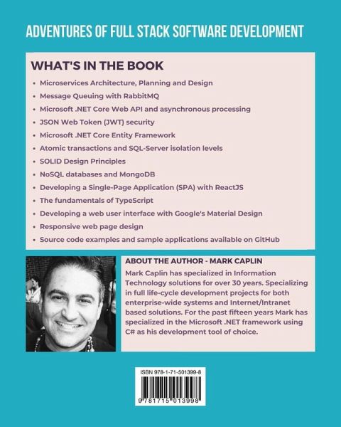Master the skills required to become a Full Stack Software Developer. In this book you will learn how to write a front-end single-page web application and write middle-tier object-orientated class components. To complete the full stack you will also learn how to design a back-end database and write applications that support database transactions and data integrity. Included in the book are the following topics: Microservices Architecture, Planning and Design; Message Queuing with RabbitMQ; Microsoft .NET Core Web API and asynchronous processing; JSON Web Token (JWT) security; Microsoft .NET Core Entity Framework; Atomic transactions and SQL-Server isolation levels; SOLID Design Principles; NoSQL databases and MongoDB; Developing a Single-Page Application (SPA) with ReactJS; The fundamentals of TypeScript; Developing a web user interface with Google's Material Design; Responsive web page design; Source code examples and sample applications available on GitHub;