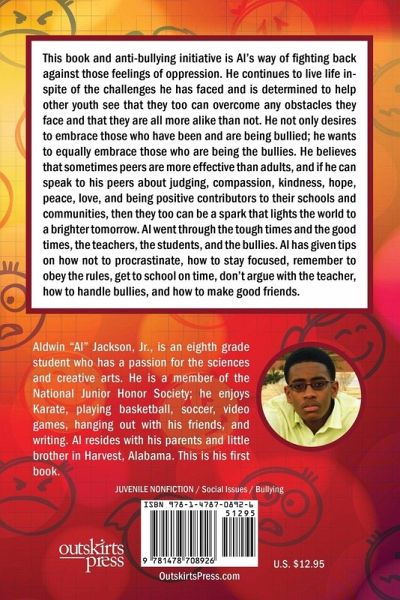 This book and anti-bullying initiative is Al's way of fighting back against those feelings of oppression. He continues to live life in-spite of the challenges he has faced and is determined to help other youth see that they too can overcome any obstacles they face and that they are all more alike than not. He not only desires to embrace those who have been and are being bullied; he wants to equally embrace those who are being the bullies. He believes that sometimes peers are more effective than adults, and if he can speak to his peers about judging, compassion, kindness, hope, peace, love, and being positive contributors to their schools and communities, then they too can be a spark that lights the world to a brighter tomorrow. Al went through the tough times and the good times, the teachers, the students, and the bullies. Al has given tips on how not to procrastinate, how to stay focused, remember to obey the rules, get to school on time, don't argue with the teacher, how to handle bullies, and how to make good friends.