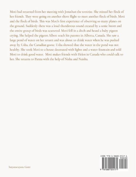 Moti had returned from her meeting with Jonathan the tortoise. She missed her flock of her friends. They were going on another short flight to meet another flock of birds. Moti and the flock of birds. This was Moti's first experience of observing so many planes on the ground. Suddenly there was a loud thunderous sound created by a sonic boom and the entire group of birds was scattered. Moti fell in a ditch and heard a baby pigeon crying. She helped the pigeon Albert reach his parents in Alberta, Canada. She saw a large pond of water on her return and was about to drink water when he was pushed away by Usha, the Canadian goose. Usha showed that the water in the pond was not healthy. She took Moti to a house decorated with lights and a water fountain and told Moti to drink good water. Moti makes friends with Helen in Canada who could talk to her. She returns to Panna with the help of Nisha and Naisha.