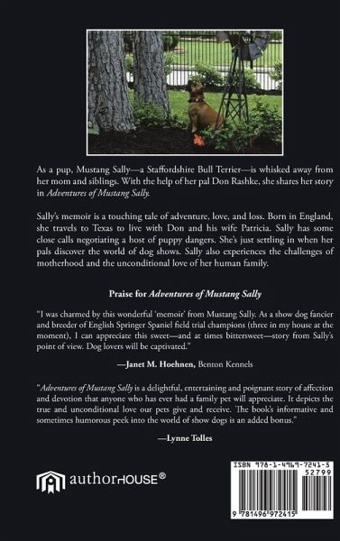 As a pup, Mustang Sally-a Staffordshire Bull Terrier-is whisked away from her mom and siblings. With the help of her pal Don Rashke, she shares her story in Adventures of Mustang Sally. Sally's memoir is a touching tale of adventure, love, and loss. Born in England, she travels to Texas to live with Don and his wife Patricia. Sally has some close calls negotiating a host of puppy dangers. She's just settling in when her pals discover the world of dog shows. Sally also experiences the challenges of motherhood and the unconditional love of her human family. Praise for Adventures of Mustang Sally "I was charmed by this wonderful 'memoir' from Mustang Sally. As a show dog fancier and breeder of English Springer Spaniel field trial champions (three in my house at the moment), I can appreciate this sweet-and at times bittersweet-story from Sally's point of view. Dog lovers will be captivated." -Janet M. Hoehnen, Benton Kennels "Adventures of Mustang Sally is a delightful, entertaining and poignant story of affection and devotion that anyone who has ever had a family pet will appreciate. It depicts the true and unconditional love our pets give and receive. The book's informative and sometimes humorous peek into the world of show dogs is an added bonus." -Lynne Tolles