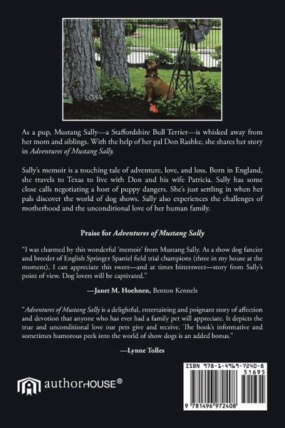 As a pup, Mustang Sally-a Staffordshire Bull Terrier-is whisked away from her mom and siblings. With the help of her pal Don Rashke, she shares her story in Adventures of Mustang Sally. Sally's memoir is a touching tale of adventure, love, and loss. Born in England, she travels to Texas to live with Don and his wife Patricia. Sally has some close calls negotiating a host of puppy dangers. She's just settling in when her pals discover the world of dog shows. Sally also experiences the challenges of motherhood and the unconditional love of her human family. Praise for Adventures of Mustang Sally "I was charmed by this wonderful 'memoir' from Mustang Sally. As a show dog fancier and breeder of English Springer Spaniel field trial champions (three in my house at the moment), I can appreciate this sweet-and at times bittersweet-story from Sally's point of view. Dog lovers will be captivated." -Janet M. Hoehnen, Benton Kennels "Adventures of Mustang Sally is a delightful, entertaining and poignant story of affection and devotion that anyone who has ever had a family pet will appreciate. It depicts the true and unconditional love our pets give and receive. The book's informative and sometimes humorous peek into the world of show dogs is an added bonus." -Lynne Tolles