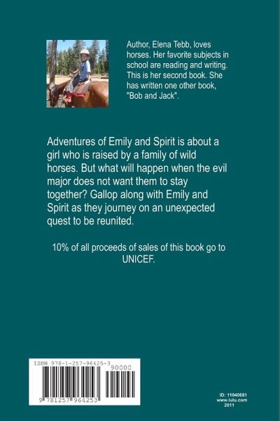 Adventures of Adventures of Spirit and Emily is about a girl who is raised by a family of wild horses. But what will happen when the evil major does not want them to stay together? Gallop along with Spirit and Emily as they journey on an unexpected quest to be reunited. 10%% of proceeds from sales of this book go to UNICEF.