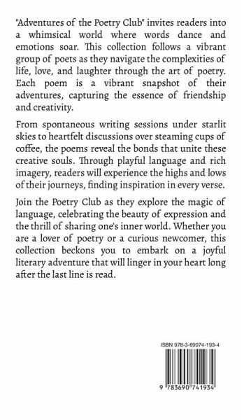 "Adventures of the Poetry Club" invites readers into a whimsical world where words dance and emotions soar. This collection follows a vibrant group of poets as they navigate the complexities of life, love, and laughter through the art of poetry. Each poem is a vibrant snapshot of their adventures, capturing the essence of friendship and creativity. From spontaneous writing sessions under starlit skies to heartfelt discussions over steaming cups of coffee, the poems reveal the bonds that unite these creative souls. Through playful language and rich imagery, readers will experience the highs and lows of their journeys, finding inspiration in every verse. Join the Poetry Club as they explore the magic of language, celebrating the beauty of expression and the thrill of sharing one's inner world. Whether you are a lover of poetry or a curious newcomer, this collection beckons you to embark on a joyful literary adventure that will linger in your heart long after the last line is read.