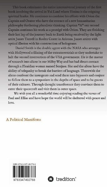 This book culminates the entire interuniversal journey of the first book involving the arrival in Ysá Land where Yimina is the reigning spiritual leader. He continues to combine his efforts with Orion the Captain and Orator who have the essence of a new humanitarian philosophy furthering pluralistic thinking. Captian "A" our second Captain continues his work as a protégé with Orion. They are finishing their last leg of the journey back to Earth being received by the light artist James Turrell in Roden Crater in Arizona. James assists with optical illusion with his construction of holograms. Daniel Smith is the double agent with the NASA who arranges with Hollywood a filming of the extraterrestrials as they undertake to halt the second insurrection of the USA government. He is the master of research into aliens in our Milky Way and has had direct contact through a Pleaidian woman named Semjase. She and the aliens have the ability of telepathy to break the barriers of language. Therewith the aliens confront the insurgents and send them into hypnosis and conjure to follow them to a symposium in the depths of space and to be guests of their cultures. Through thought transference they convince them to enter their spacecraft and visit them in outer space. We wish you all a wonderful time enjoying reading the verses of Paul and Ellias and have hope the world will be sheltered with peace and love.