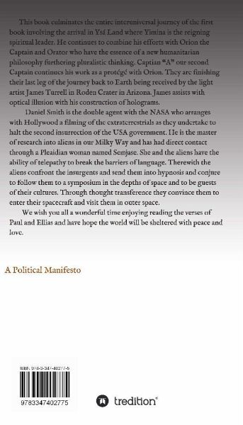 This book culminates the entire interuniversal journey of the first book involving the arrival in Ysá Land where Yimina is the reigning spiritual leader. He continues to combine his efforts with Orion the Captain and Orator who have the essence of a new humanitarian philosophy furthering pluralistic thinking. Captian "A" our second Captain continues his work as a protégé with Orion. They are finishing their last leg of the journey back to Earth being received by the light artist James Turrell in Roden Crater in Arizona. James assists with optical illusion with his construction of holograms. Daniel Smith is the double agent with the NASA who arranges with Hollywood a filming of the extraterrestrials as they undertake to halt the second insurrection of the USA government. He is the master of research into aliens in our Milky Way and has had direct contact through a Pleaidian woman named Semjase. She and the aliens have the ability of telepathy to break the barriers of language. Therewith the aliens confront the insurgents and send them into hypnosis and conjure to follow them to a symposium in the depths of space and to be guests of their cultures. Through thought transference they convince them to enter their spacecraft and visit them in outer space. We wish you all a wonderful time enjoying reading the verses of Paul and Ellias and have hope the world will be sheltered with peace and love.