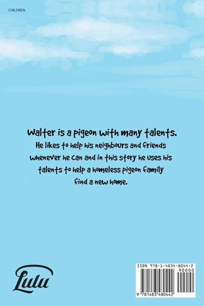 Walter is a pigeon with many talents. He likes to help his neighbours and friends whenever he can and in this story he uses his talents to help a homeless pigeon family find a new home.