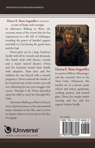 Dorea E. Ross Arguelles's memoir is one of hope and courage. In Adventures Walking on Water, she recounts many of the events that she has experienced in a life full of challenges, revealing the power of familial support and faith in God during the good times and the bad. Dorea grew up in a large Southern family with all its rewards and demands. Her family dealt with divorce, suicide and a major natural disaster. Dorea and her husband started their family with adoption. Years later and five children she was blessed with a miracle pregnancy. Dorea endured the deaths of her husband and of their twelve-year-old son, following his two-year struggle with cancer. Through it all, Dorea depended upon her faith to carry her through life's trials. Adventures Walking on Water is Dorea's story of perseverance as she encountered many obstacles in her life, and it serves to inspire others to overcome in the face of tragedy.