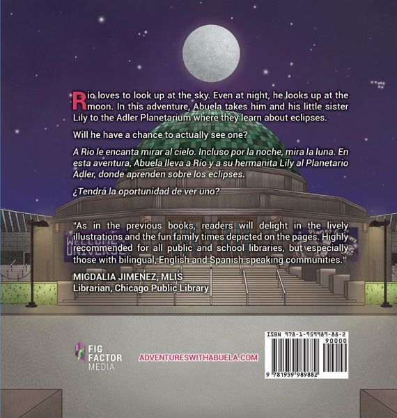 Rio loves to look up at the sky. Even at night, he looks up at the moon. In this adventure, Abuela takes him and his little sister Lily to the Adler Planetarium where they learn about eclipses. Will he have a chance to actually see one? A Rio le encanta mirar al cielo. Incluso por la noche, mira la luna. En esta aventura, Abuela lleva a Ri¿o y a su hermanita Lily al Planetario Adler, donde aprenden sobre los eclipses. ¿Tendrä la oportunidad de ver uno?
