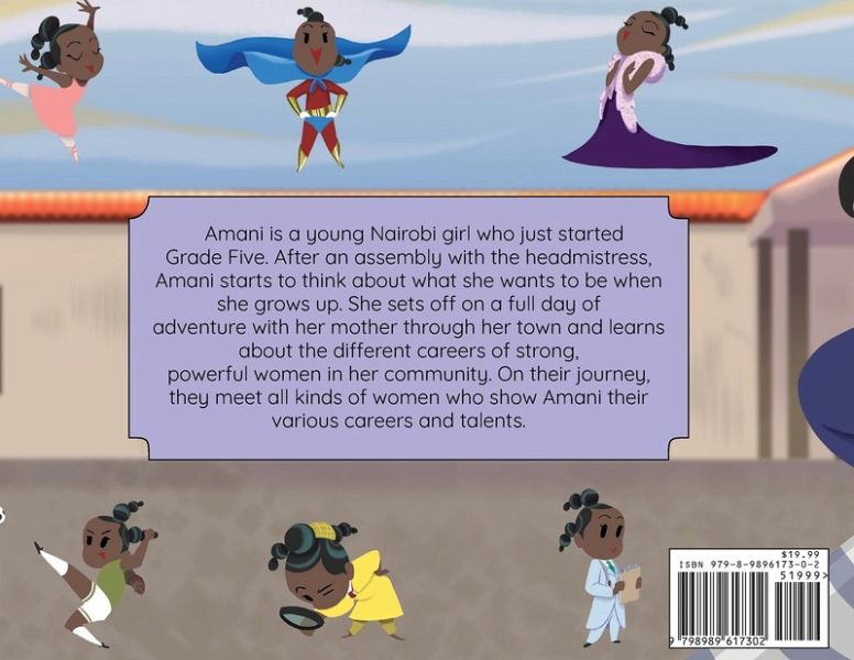 Amani is a young girl in elementary school in Kenya. After an assembly with the headmistress, Amani starts to think about what she wants to be when she grows up. Will Amani be a musician? Journalist? Business woman? Programmer? Math Teacher? Data Scientist? Or what? She sets off on a full day of adventure with her mother through her town and learns about the different careers of strong, powerful women in her community. On their journey, they meet all kinds of women who show Amani their various careers and talents. This book challenges readers to think outside the box; some may even learn some Swahili!