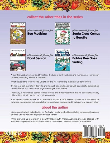 A bushfire has broken out and threatens the lives of both the bees and humans, not to mention all the surrounding wildlife in the area. What caused the fire? Will Fire Chief Ben and his team bring the blaze under control? It's the football playoffs in Beeville and through circumstance as well as curiosity, Bobbie Bee and his friends find themselves in grave danger from the fire. Thankfully, a native bee comes to their rescue and introduces them into his bee-world, so very different from their own home and community. Bobbie Bee and his friends learn the valuable lesson that there may be cultural differences between bee species, but essentially everyone has a purpose and is as important as each other.