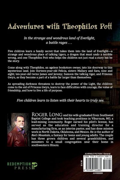 In the strange and wondrous land of Everlight, a battle rages . . . Five children learn a family secret that takes them into the land of Everlight—a strange and wondrous place of talking tigers, a dragon that must undo a terrible wrong, and one Theophilos Pott who helps the children not just read a story but be the story. Come along with Theophilos, an ageless bookstore owner, into his doorway to this mysterious land. Join thirteen-year-old Felicia, sisters Mallary and Sara, nine and eight; ten-year-old twins James and Jeremy; Samson the talking tiger, and Princess Gwyn, as they become a part of a battle far larger than themselves. As spreading darkness threatens to destroy the power of the Light, the children come to the aid of Princess Gwyn, learn to face difficulties with courage, the value of friendship, and how to live a life of purpose. Five children learn to listen with their hearts to truly see.