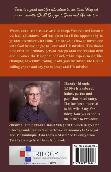 There is a great need for adventure in our lives. Why not adventure with God? Say yes to Jesus and His missions. ¿¿We are not tired because we lack sleep. We are tired because we lack adventure. God has given us all the opportunity to go and adventure with Him. Tim shows us how to adventure with God by saying yes to Jesus and His mission. Tim shows how even an ordinary person can go onto the mission field and advance the Kingdom of God, while experiencing life-changing adventure. Young or old, join the adventure God is calling you to and say yes to Jesus and His mission.