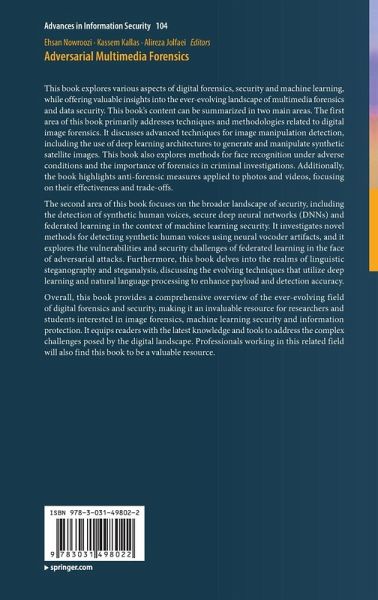 Chapter. 1. Model Poisoning Attack against Federated Learning with Adaptive Aggregation.- Chapter. 2. Image Forgery Detection using Comprint: A Comprehensive Study.- Chapter. 3. Good or evil: Generative adversarial networks in digital forensics.- Chapter. 4. Refined GAN-Based Attack Against Image Splicing Detection and Localization Algorithms.- Chapter. 5. Generative Adversarial networks for Artificial Satellite Image Creation and Manipulation.- Chapter. 6. Domain Specific Information based learning for Facial Image Forensics.- Chapter. 7. Linguistic Steganography and Linguistic Steganalysis.- Chapter. 8. Random Deep Feature Selection's Efficiency in Securing Image Manipulation Detectors Opposed by Adversarial Attacks.- Chapter. 9. Optimized Distribution for Robust Watermarking of Deep neural Networks through Fixed Embedding Weights.- Chapter. 10. Anti Forensic Measures and Their Impact on Forensic Investigations.- Chapter. 11. Using Vocoder Artifacts for Audio Deepfakes Detection.