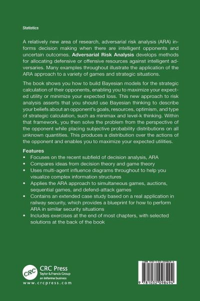 A relatively new area of research, adversarial risk analysis (ARA) informs decision making when there are intelligent opponents and uncertain outcomes. Adversarial Risk Analysis develops methods for allocating defensive or offensive resources against intelligent adversaries. Many examples throughout illustrate the application of the ARA approach to a variety of games and strategic situations.
