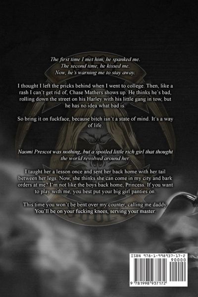 The first time I met him, he spanked me. The second time, he kissed me. Now, he's warning me to stay away. I thought I left the pricks behind when I went to college. Then, like a rash I can't get rid of, Chase Mathers shows up. He thinks he's bad, rolling down the street on his Harley with his little gang in tow, but he has no idea what bad is. So bring it on fuckface, because bitch isn't a state of mind. It's a way of life. Naomi Prescot was nothing, but a spoiled little rich girl that thought the world revolved around her. I taught her a lesson once and sent her back home with her tail between her legs. Now, she thinks she can come in my city and bark orders at me? I'm not like the boys back home, Princess. If you want to play with me, you best put your big girl panties on. This time you won't be bent over my counter, calling me daddy. You'll be on your fucking knees, serving your master.