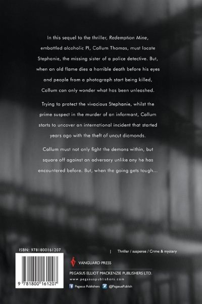 In this sequel to the thriller, Redemption Mine, embattled alcoholic PI, Callum Thomas, must locate Stephanie, the missing sister of a police detective. But, when an old flame dies a horrible death before his eyes and people from a photograph start being killed, Callum can only wonder what has been unleashed.Trying to protect the vivacious Stephanie, whilst the prime suspect in the murder of an informant, Callum starts to uncover an international incident that started years ago with the theft of uncut diamonds. Callum must not only fight the demons within, but square off against an adversary unlike any he has encountered before. But, when the going gets tough...