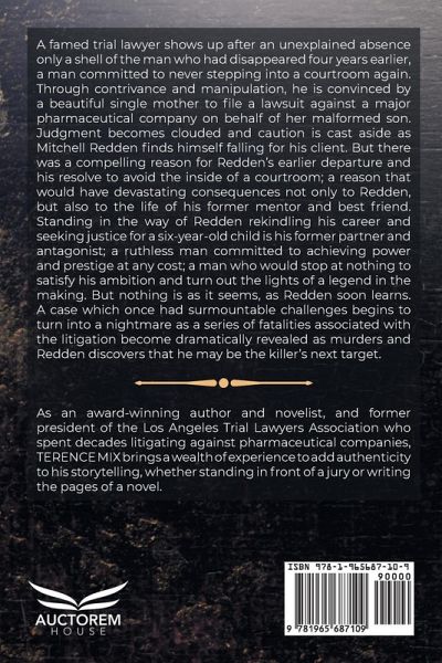 A famed trial lawyer shows up after an unexplained absence only a shell of the man who had disappeared four years earlier, a man committed to never stepping into a courtroom again. Through contrivance and manipulation, he is convinced by a beautiful single mother to file a lawsuit against a major pharmaceutical company on behalf of her malformed son. Judgment becomes clouded and caution is cast aside as Mitchell Redden finds himself falling for his client. But there was a compelling reason for Redden's earlier departure and his resolve to avoid the inside of a courtroom; a reason that would have devastating consequences not only to Redden, but also to the life of his former mentor and best friend. Standing in the way of Redden rekindling his career and seeking justice for a six-year-old child is his former partner and antagonist; a ruthless man committed to achieving power and prestige at any cost; a man who would stop at nothing to satisfy his ambition and turn out the lights of a legend in the making. But nothing is as it seems, as Redden soon learns. A case which once had surmountable challenges begins to turn into a 1nightmare as a series of fatalities associated with the litigation become dramatically revealed as murders and Redden discovers that he may be the killer's next target.