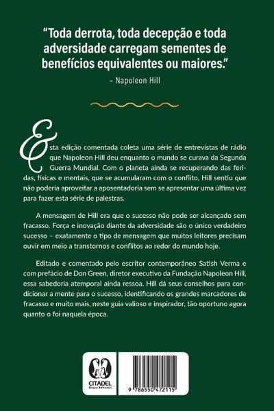 ¿Toda derrota, toda decepção e toda adversidade carregam sementes de benefícios equivalentes ou maiores.¿ (Napoleon Hill) Esta edição comentada coleta uma série de entrevistas de rádio que Napoleon Hill deu enquanto o mundo se curava da Segunda Guerra Mundial. Com o planeta ainda se recuperando das feridas, físicas e mentais, que se acumularam com o conflito, Hill sentiu que não poderia aproveitar a aposentadoria sem se apresentar uma última vez para fazer esta série de palestras. A mensagem de Hill era que o sucesso não pode ser alcançado sem fracasso. Força e inovação diante da adversidade são o único verdadeiro sucesso ¿ exatamente o tipo de mensagem que muitos leitores precisam ouvir em meio a transtornos e conflitos ao redor do mundo hoje. Editado e comentado pelo escritor contemporâneo Satish Verma e com prefácio de Don Green, diretor executivo da Fundação Napoleon Hill, essa sabedoria atemporal ainda ressoa. Hill dá seus conselhos para condicionar a mente para o sucesso, identificando os grandes marcadores de fracasso e muito mais, neste guia valioso e inspirador, tão oportuno agora quanto o foi naquela época.
