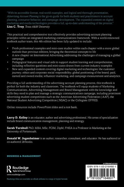 "With its accessible format, real-world examples, and logical and thorough presentation, Advertising Account Planning is the go-to guide for both students and practitioners in account planning, consumer behavior, and campaign development. The expanded content on digital marketing and media technologies provides a full, up-to-date understanding of the process."