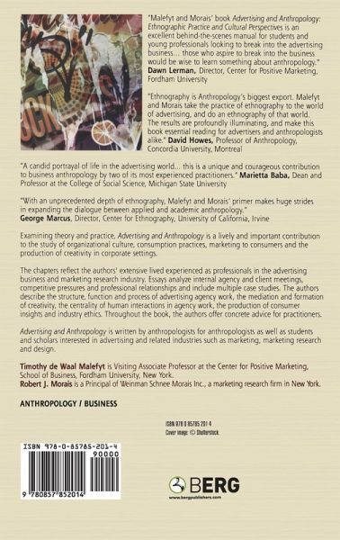 Timothy de Waal Malefyt is Visiting Associate Professor at the Center for Positive Marketing, School of Business, Fordham University, New York.Robert J. Morais is a Principal of Weinman Schnee Morais Inc., a marketing research firm in New York, USA.
