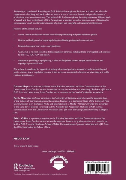 The volume is developed for upper-level undergraduate and graduate students in media, advertising and public relations law or regulation courses. It also serves as an essential reference for advertising and public relations practitioners.