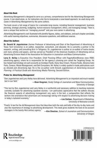 Suitable for the Advertising Management course, this book follows the more general Principles of Advertising course. It covers a range of topics for a semester-long course, including financial management, business planning, strategic planning, budgeting, human resource management, ethics, and managing change.
