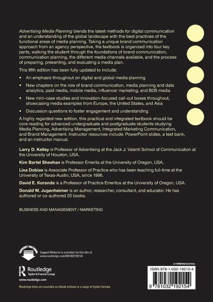 A highly regarded new edition, this practical and integrated textbook should be core reading for advanced undergraduate and postgraduate students studying Media Planning, Advertising Management, Integrated Marketing Communication, and Brand Management. Instructor resources include: PowerPoint slides, a test bank, and an instructor manual.