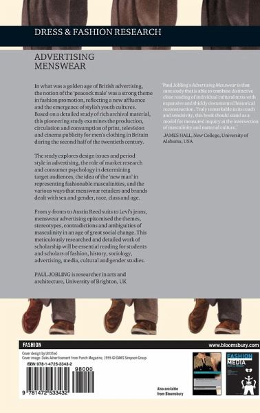 Choice Outstanding Academic Title 2014 In what was a golden age of British advertising, the notion of the 'peacock male' was a strong theme in fashion promotion, reflecting a new affluence and the emergence of stylish youth cultures. Based on a detailed study of rich archival material, this pioneering study examines the production, circulation and consumption of print, television and cinema publicity for men's clothing in Britain during the second half of the twentieth century. The study explores design issues and period style in advertising, the role of market research and consumer psychology in determining target audiences, the idea of the 'new man' in representing fashionable masculinities, and the various ways that menswear retailers and brands dealt with sex and gender, race, class and age. From y-fronts to Austin Reed suits to Levi's jeans, menswear advertising epitomised the themes, stereotypes, contradictions and ambiguities of masculinity in an age of great social change. This meticulously researched and detailed work of scholarship will be essential reading for students and scholars of fashion, history, sociology, advertising, media, cultural and gender studies.