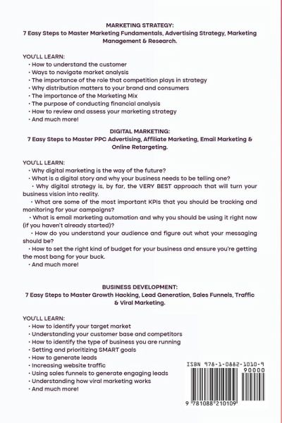 Advertising Strategy - 3 Manuscripts in 1 Book, Including: Marketing Strategy, Digital Marketing and Business Development. 1) MARKETING STRATEGY: 7 Easy Steps to Master Marketing Fundamentals, Advertising Strategy, Marketing Management & Research. YOU'LL LEARN:How to understand the customer Ways to navigate market analysis The importance of the role that competition plays in strategy Why distribution matters to your brand and consumers The importance of the Marketing Mix The purpose of conducting financial analysis How to review and assess your marketing strategy And much more! 2) DIGITAL MARKETING: 7 Easy Steps to Master PPC Advertising, Affiliate Marketing, Email Marketing & Online Retargeting. YOU'LL LEARN:Why digital marketing is the way of the future? What is a digital story and why your business needs to be telling one? Why digital strategy is, by far, the VERY BEST approach that will turn your business vision into reality. What are some of the most important KPIs that you should be tracking and monitoring for your campaigns? What is email marketing automation and why you should be using it right now (if you haven't already started)? How do you understand your audience and figure out what your messaging should be? How to set the right kind of budget for your business and ensure you're getting the most bang for your buck. And much more! 3) BUSINESS DEVELOPMENT: 7 Easy Steps to Master Growth Hacking, Lead Generation, Sales Funnels, Traffic & Viral Marketing. YOU'LL LEARN: · How to identify your target market · Understanding your customer base and competitors · How to identify the type of business you are running · Setting and prioritizing SMART goals · How to generate leads · Increasing website traffic · Using sales funnels to generate engaging leads · Understanding how viral marketing works · And much more!