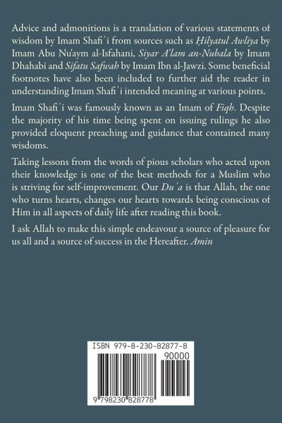 Advice and admonitions is a translation of various statements of wisdom by Imam Shafi¿i from sources such as ¿ilyatul Awliya by Imam Abu Nu'aym al-Isfahani, Siyar A'lam an-Nubala by Imam Dhahabi and Sifatu Safwah by Imam Ibn al-Jawzi. Some beneficial footnotes have also been included to further aid the reader in understanding Imam Shafi¿i intended meaning at various points. Imam Shafi¿i was famously known as an Imam of Fiqh. Despite the majority of his time being spent on issuing rulings he also provided eloquent preaching and guidance that contained many wisdoms. Taking lessons from the words of pious scholars who acted upon their knowledge is one of the best methods for a Muslim who is striving for self-improvement. Our Düa is that Allah, the one who turns hearts, changes our hearts towards being conscious of Him in all aspects of daily life after reading this book. I ask Allah to make this simple endeavour a source of pleasure for us all and a source of success in the Hereafter. Amin